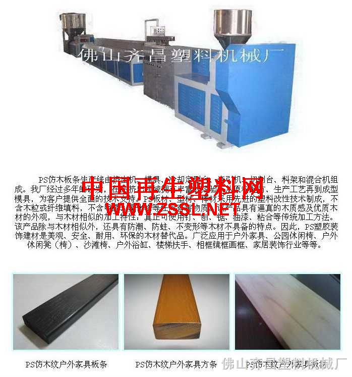 PS仿木板条生产线由挤出机,模具,冷却定型台,牵引机,切割机,料架和混合机组成。我厂经过多年的研发,在PS挤出领域拥有丰富的经验,从原料配方、生产工艺再到成型模具,为客户提供全面的技术支持。 PS仿木与实木相比由于成本和性能方面的优势正在兴起,广泛用于户外家具行业,不使用PVC原料,不使用木材填料,不含甲醛、氯化物等对人体有害的物质,其产品有逼真的木质感与外观,与木材有相似的加工特性,可钉可刨可粘,又具有比木材更优越的特性:防水!防虫蛀!防霉不变型!不会因日晒雨淋而出现裂缝,它的价格远低于优质木材的同类产品,是美观、安全、耐用、环保、理想的木材替代品,广泛应用于户外家具、公园休闲椅、户外休闲凳(椅)、沙滩椅、户外浴缸、楼梯扶手、相框镜框画框、家居装饰行业等等。是喜好实木制户外休闲家具爱好者的首选。
